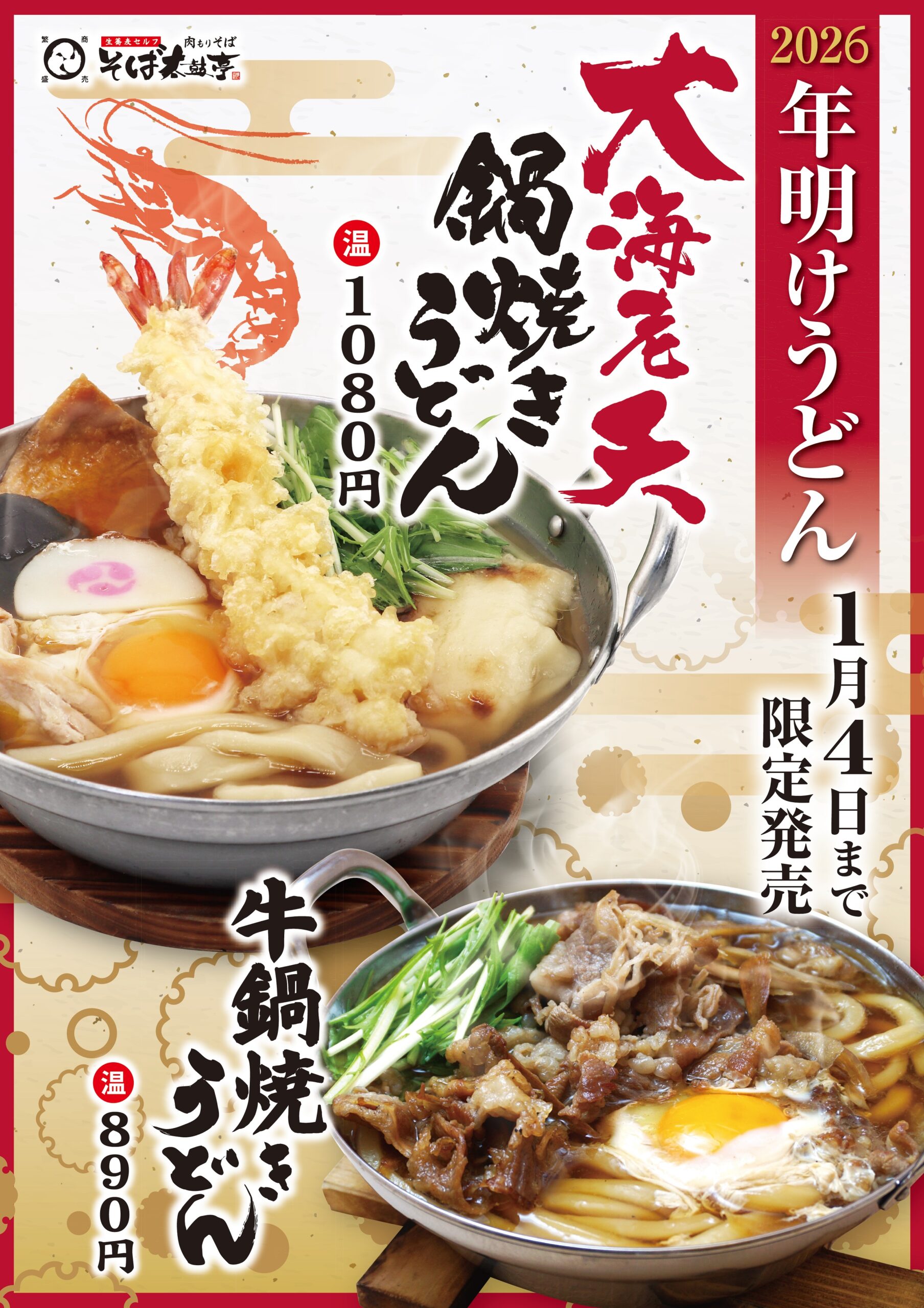 ●大海老天鍋焼きうどん年末年始限定の大海老天がのった、この時期だけの鍋焼きうどん。たっぷり具沢山でお腹もいっぱい♪●牛鍋焼きうどんすき焼き風の鍋焼き。甘辛な牛肉に、玉子との相性抜群。この機会にぜひお試しください。